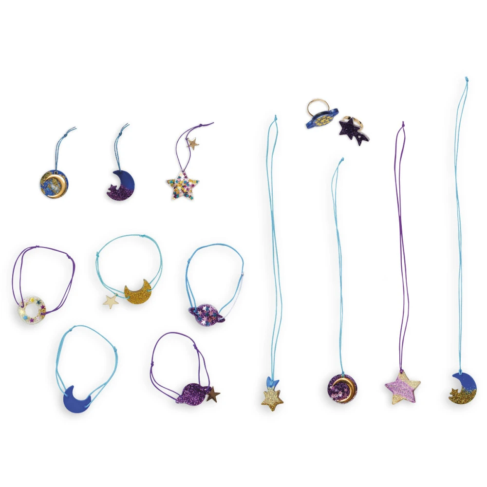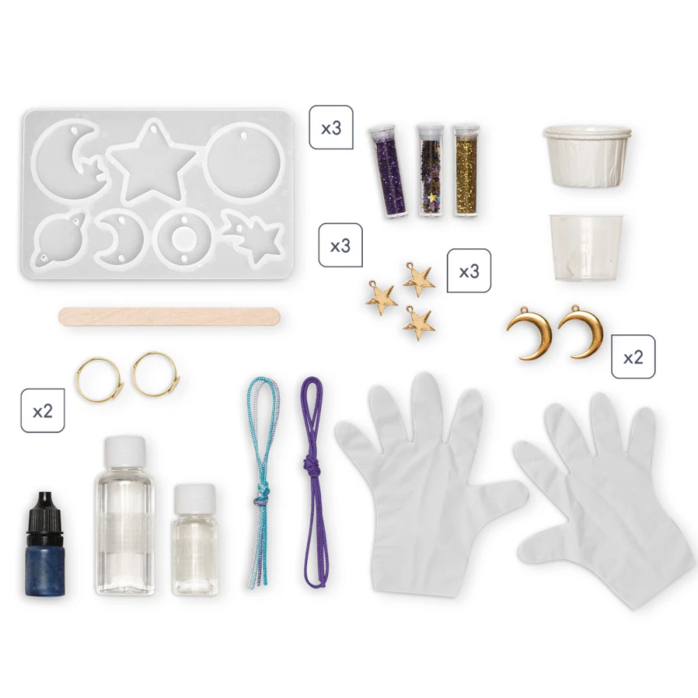 Contenu : de la résine avec son catalyseur, des moules en silicone, 1 tube de colorant, 1 coupe à mesure, 1 paire de gants, 2 tubes de paillettes, 1 tube de petites étoiles, 1 bâtonnet, des breloques et un support de bague.
