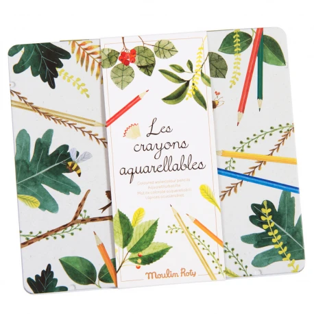 Très jolie boîte en métal avec 24 crayons de couleur aquarellables Moulin Roty