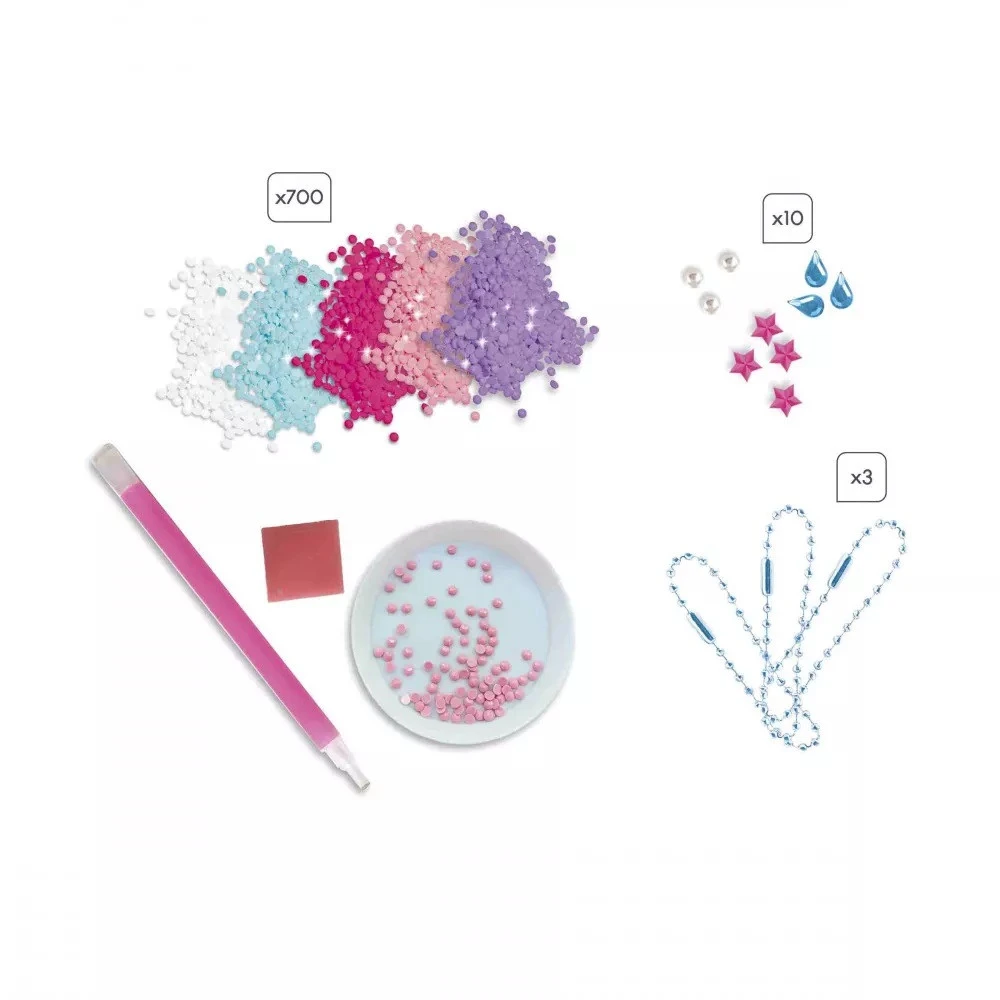 Contenu : 3 porte-clés autocollants, 3 chaînettes, 10 strass et 700 mini-strass, 1 sylet, 1 carré de cire et 1 coupelle