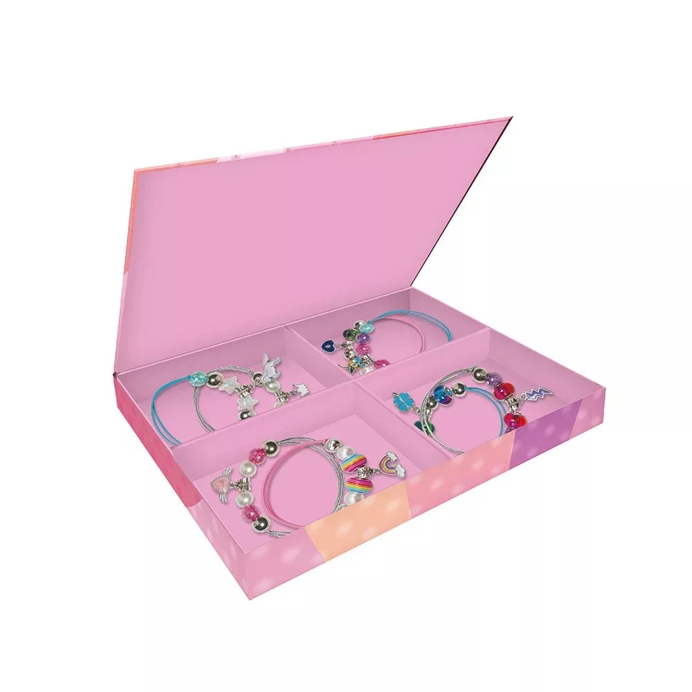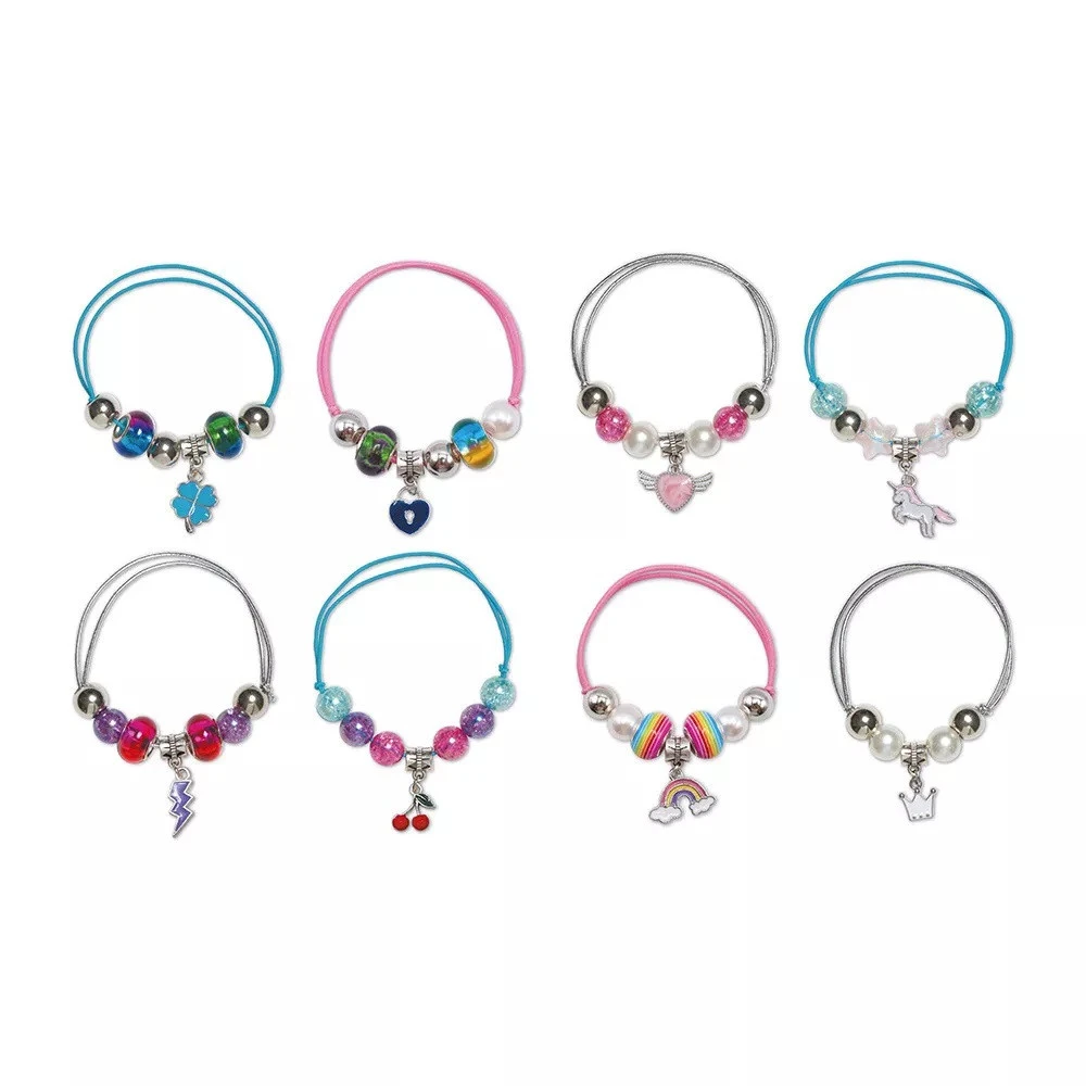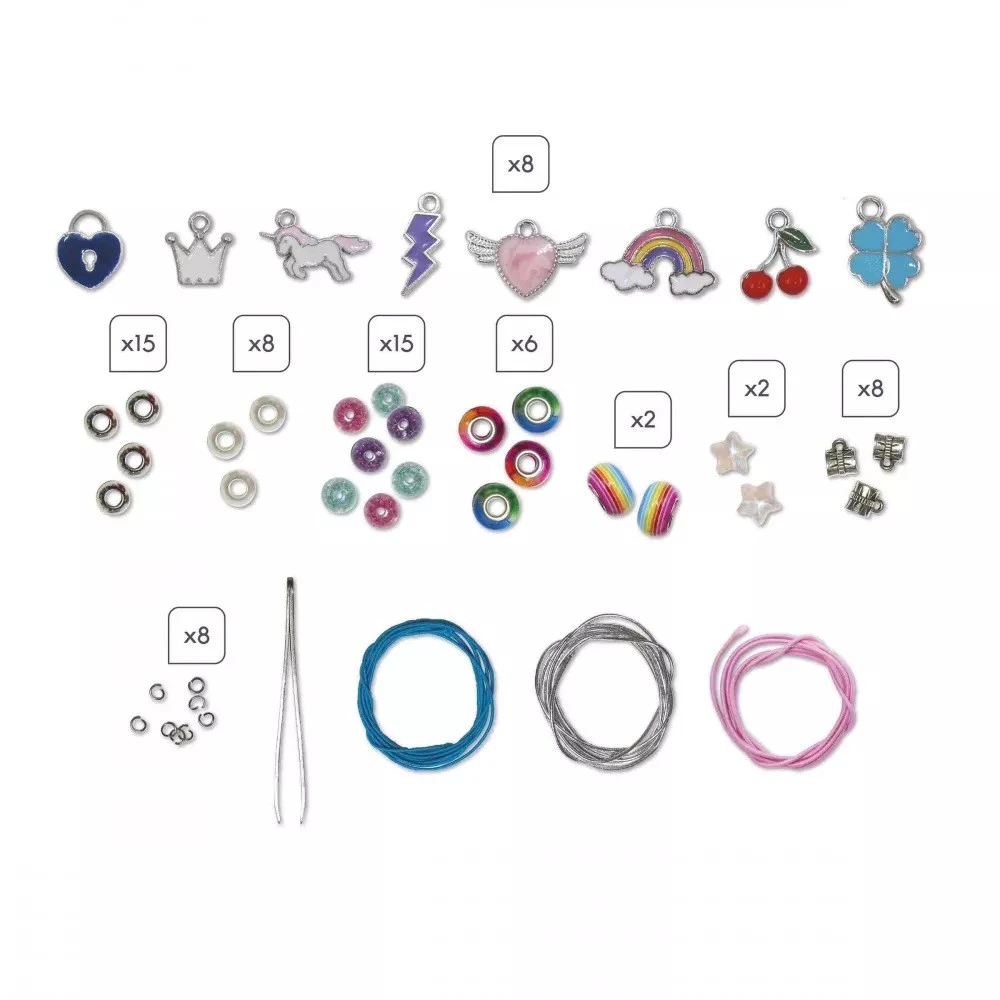 Contenu : 30 perles rondes (15 argentées et 15 craquelées), 8 perles intercalaires avec anneaux, 8 perles nacrées, 8 breloques (arc-en-ciel, coeur, trèfle, coeur ailé, cerises, couronne, licorne, éclair), 8 anneaux de raccord, 6 perles rondes dégradées, 2 perles étoiles, 2 perles arc-en-ciel, 1 pince et des fils élastiques (bleu, rose, argenté)