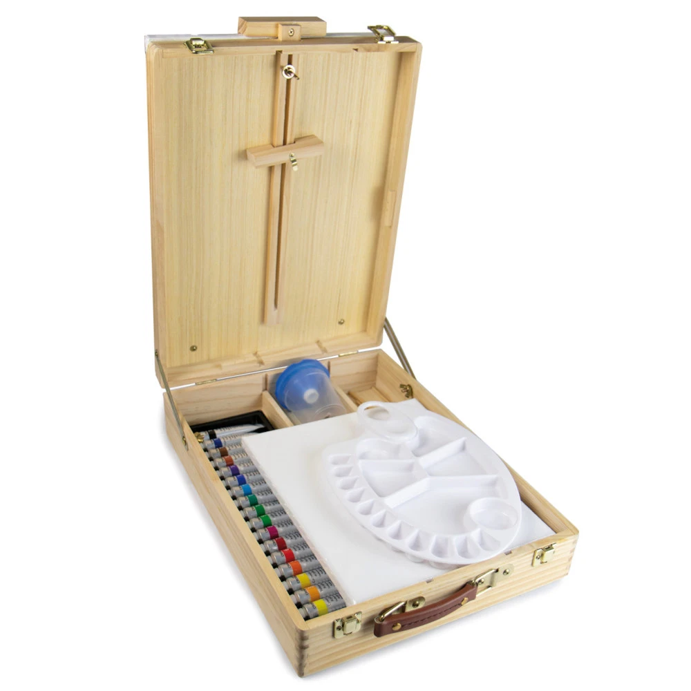 Cette valise d’artiste en bois facile à transporter contient 2 toiles, 18 tubes de peinture acrylique, 2 crayons HB, 10 pinceaux d’artiste de haute qualité, 1 palette de mélange, 1 spatule et 1 pot