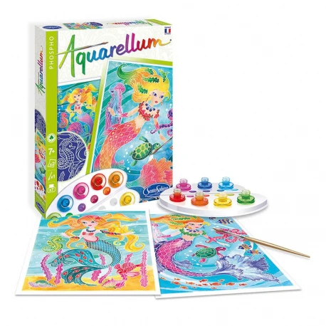 Contient 2 tableaux sertis 32,5 x 25 cm, 7 flacons d’aquarelles, 1 pinceau, 1 palette pour mélanger les encres, 1 pipette et 1 notice multilingue.