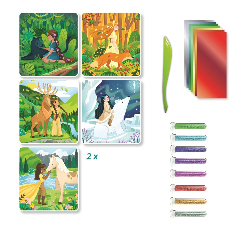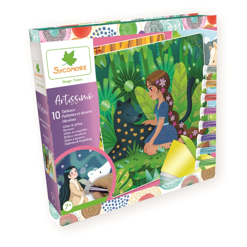 Dans la collection Artissimo, un joli coffret qui combine 2 techniques : les paillettes et le transfert de dorures et ce, pour réaliser de jolis tableaux et donner vie à des héroïnes.