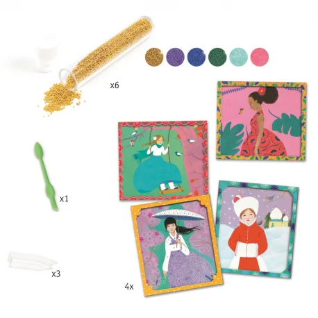 Contient 4 cartes illustrées, 6 flacons de microbilles, un outil, 3 petits pots et une notice explicative.