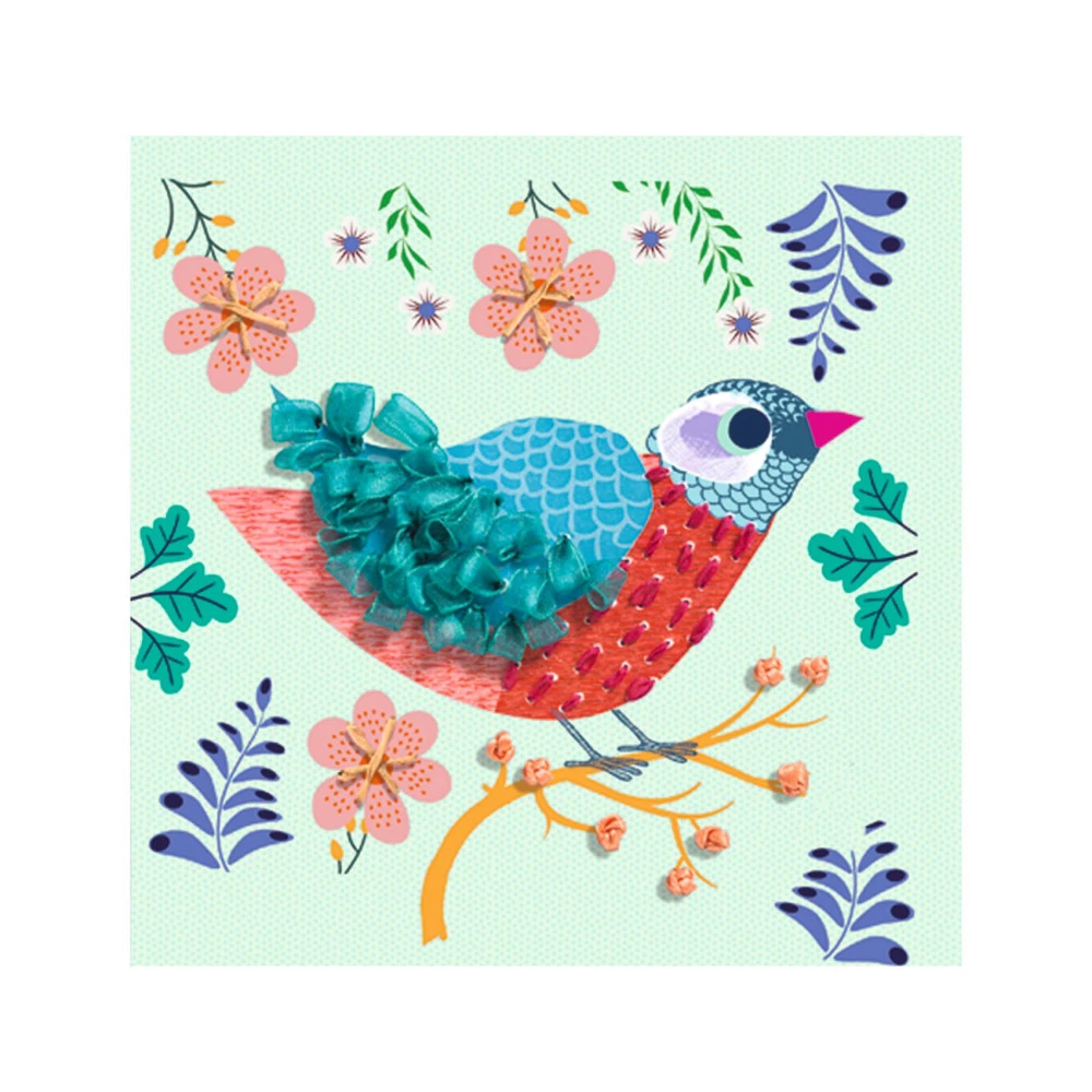 Décore et donne vie aux oiseaux des 4 cartes illustrées grâce aux rubans satinés et organza.