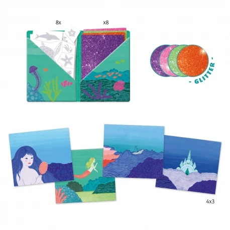 Le coffret contient 2 pochettes de rangement avec 8 feuilles de patch colle, 8 feuilles colorées et pailletées, 12 cartes illustrées de 4 modèles différents et une notice.
