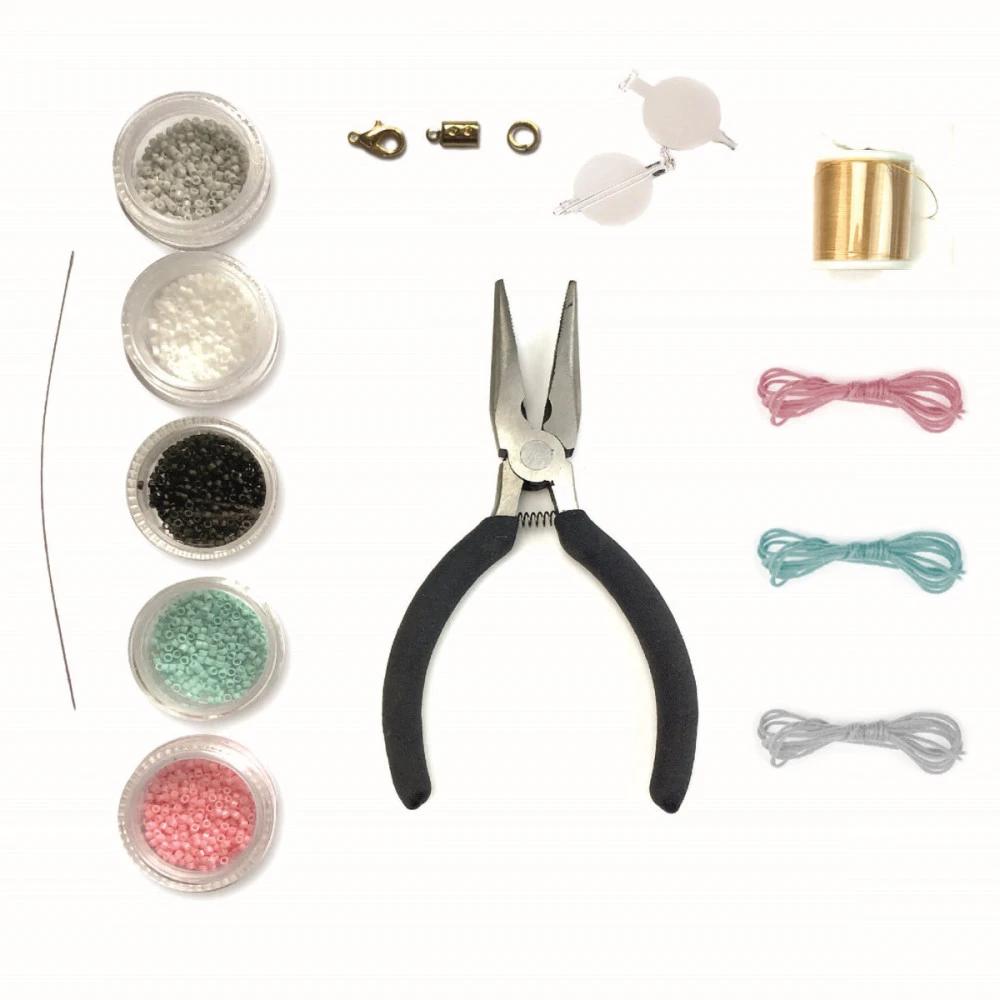 Contenu de la boîte : 5 couleurs de perles japonaises, 20 anneaux, 6 mètres de fil nylon doré, 5 fermoirs, des cordons, 1 aiguille très fine, et 1 notice explicative.