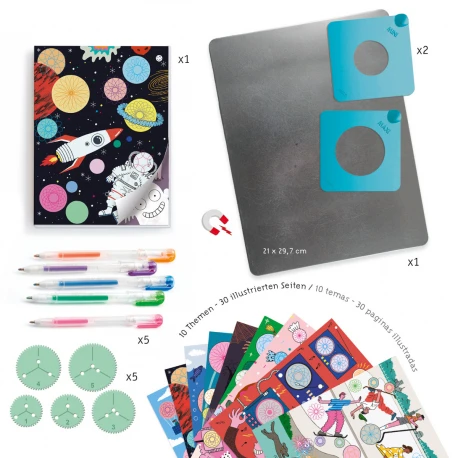 Contient une plaque métallique, 2 cadres magnétiques, 5 roues à 3 trous, 5 crayons gels, 30 pages illustrés sur 10 thèmes différents et 1 livret explicatif en couleur.