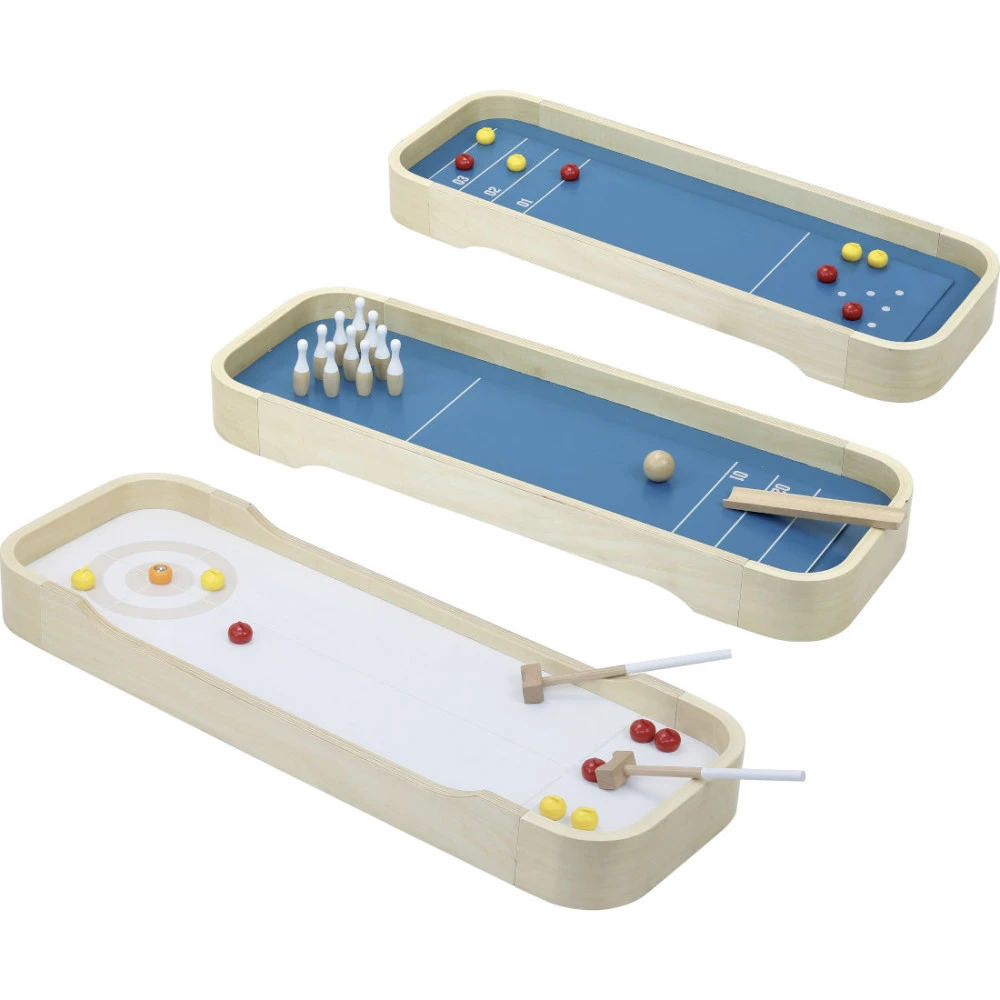 Piste de curling d’un côté et de mini bowling de l’autre avec tous les accessoires (10 quilles, 2 boules et un lanceur, 8 pucks curling, 1 but et 2 cannes de jeux) de chez Vilac