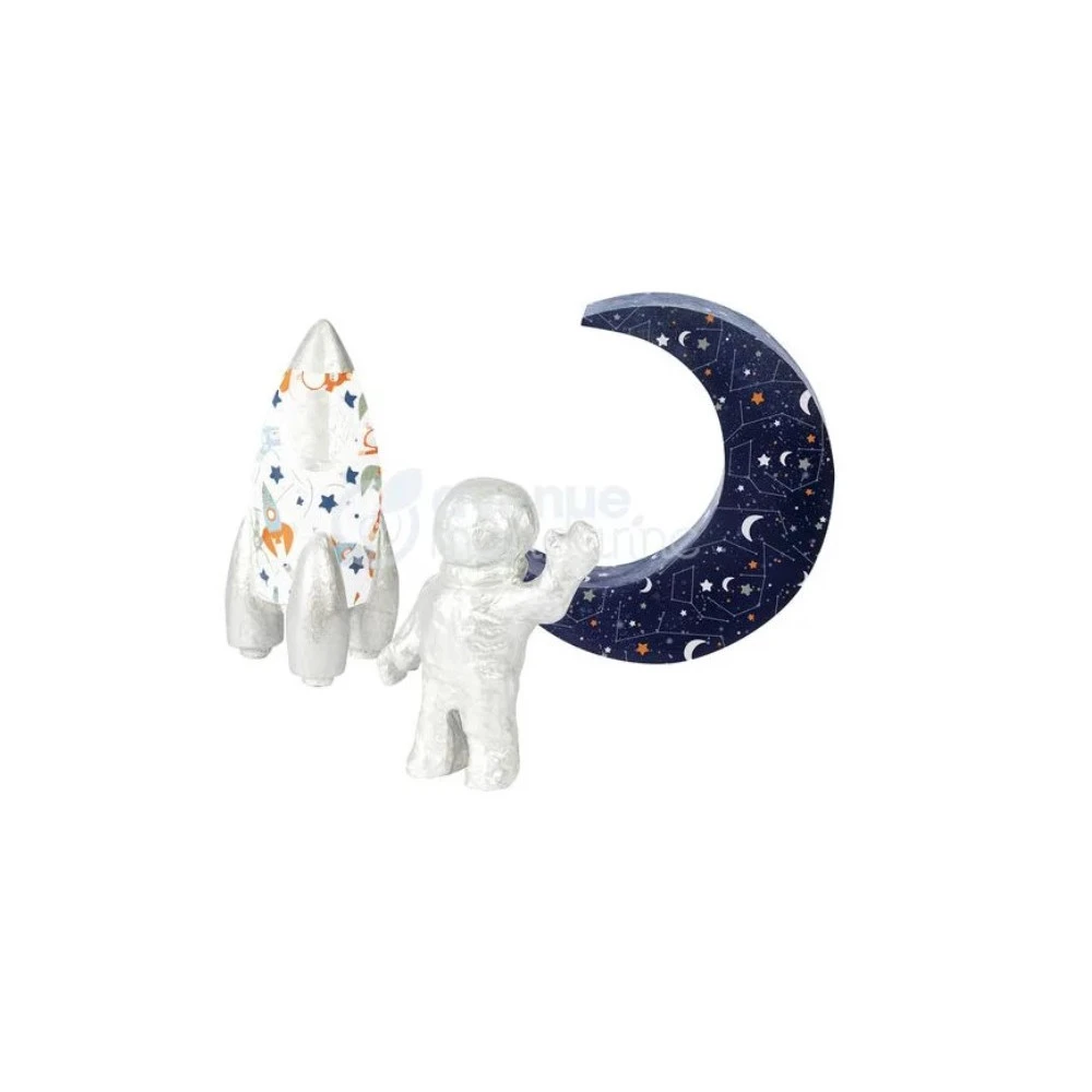 Contenu : 1 fusée, 1 cosmonaute et 1 lune en papier mâché, des feuilles décopatch, 1 pinceau, de la colle et une notice explicative.