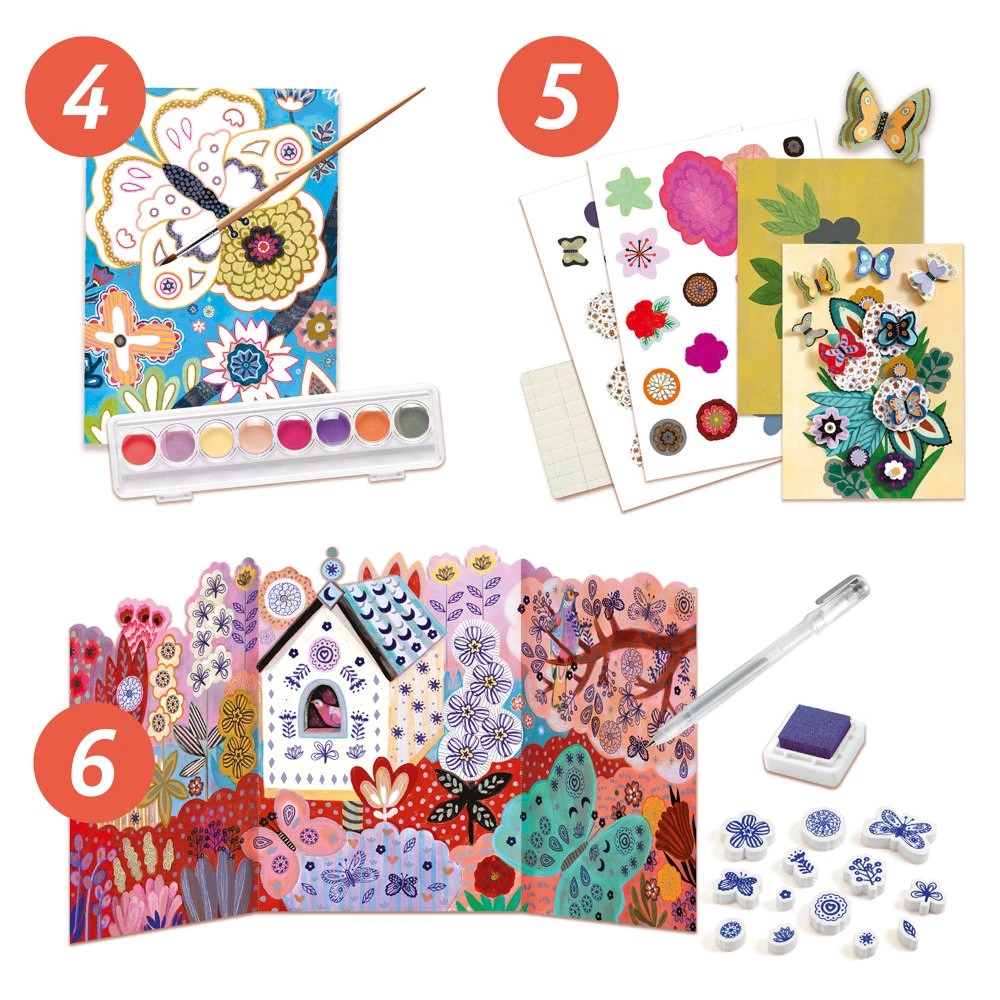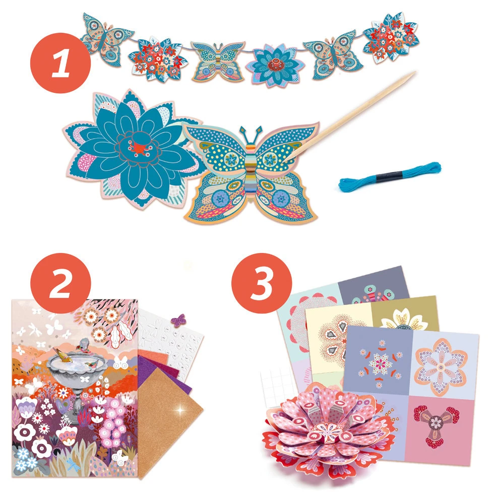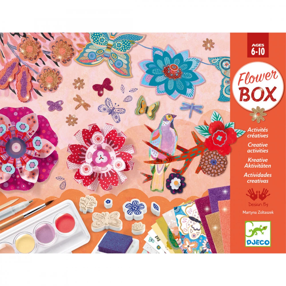 Ce coffret multi-activités Flower box ou jardin des fleurs propose 6 activités créatrices : peinture, dessin, collage,pliage,cartes à gratter et saynètes en 3D