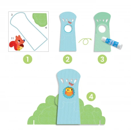 Contient : 5 cartes épaisses aux tranches blanches, illustrées et prédécoupées (20 x 20 cm), 1 tube de colle, 1 livret explicatif en couleurs.