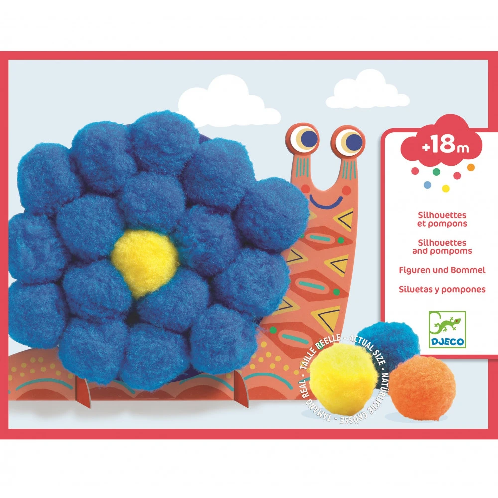 Contient 3 cartes silhouette animaux (25 x 17 cm) avec une partie autocollante, 50 gros pompons doux colorés (diamètre 4 cm), 6 supports pour maintenir les animaux debout et 1 livret explicatif en couleur