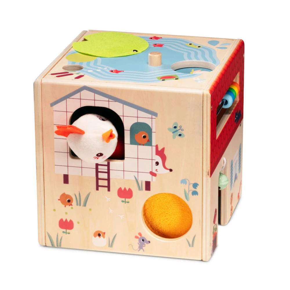 Grand cube en bois avec 10 activités sensorielles et de découverte avec la petite poule toute douce Paulette qui passe d’une face à l’autre.