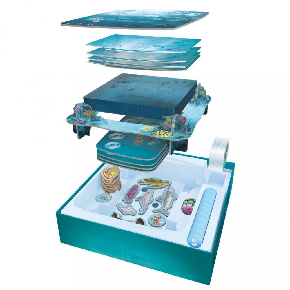 Dive vous entraîne dans les profondeurs de l’océan. Le « plateau » de jeu est constitué de grandes cartes transparentes posées les unes sur les autres. A vous d’être le plus observateur afin de discerner, par transparence, les dangers et les opportunités que vous allez rencontrer.