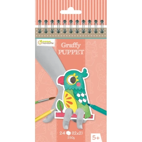 Les graffy puppet sont des carnets de coloriage avec 24 feuilles de papier dessin 250g sur lesquelles sont dessinées et prédécoupées des animaux ou des personnages. Une fois coloriés et détachés, ils vont s’animer avec les doigts de l’enfant qui pourra ainsi s’inventer des tas d’histoires.
