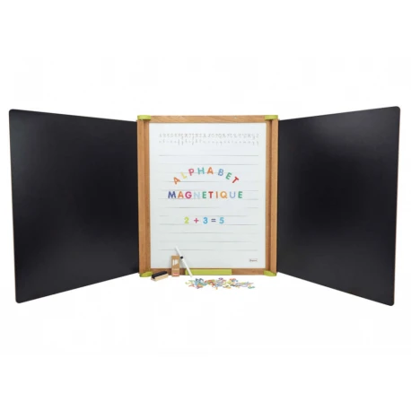 Ce grand tableau tryptique mural Jeujura comprend trois volets en bois : une ardoise centrale magnétique et deux volets avec une face craie et une face pour feutres effaçables à sec.