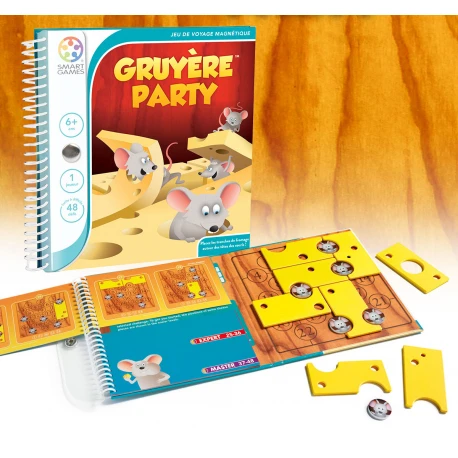 Comment jouer ? Choisissez un défi et placez alors les tranches de fromage magnétiques autour des têtes de souris. Il n’y a qu’une seule solution par défi que vous trouverez en fin de livret.