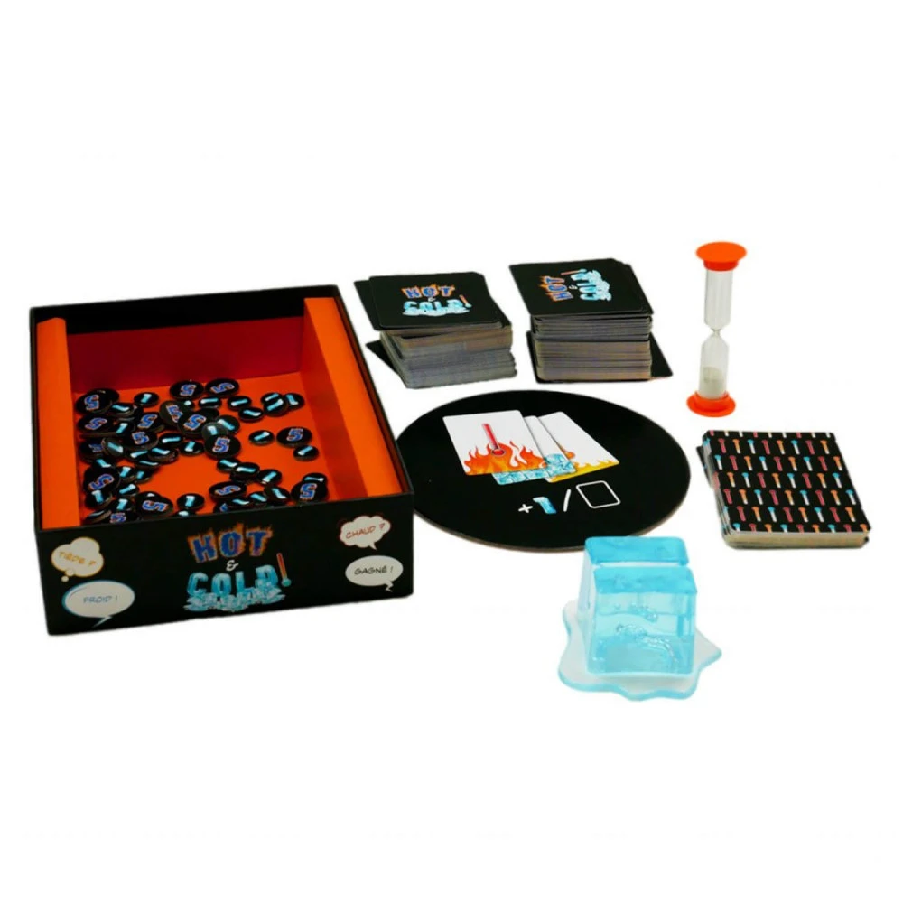 Contient : 200 cartes Mot secret, 30 cartes température,1 glaçon porte-carte, 1 plateau de validation, 80 jetons score, 1 sablier de 90 secondes et le livret de règles