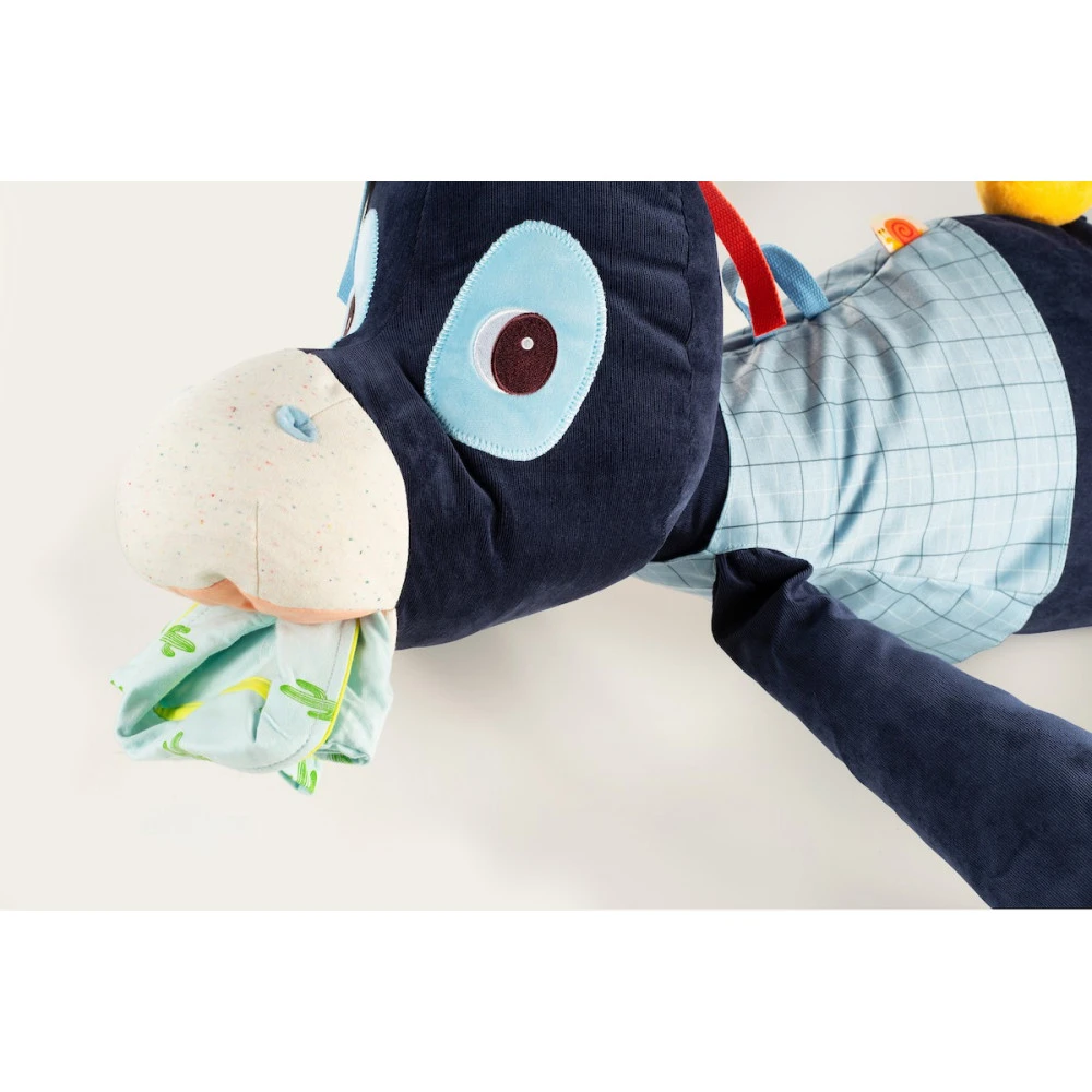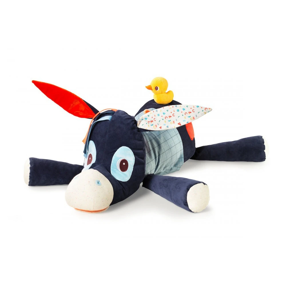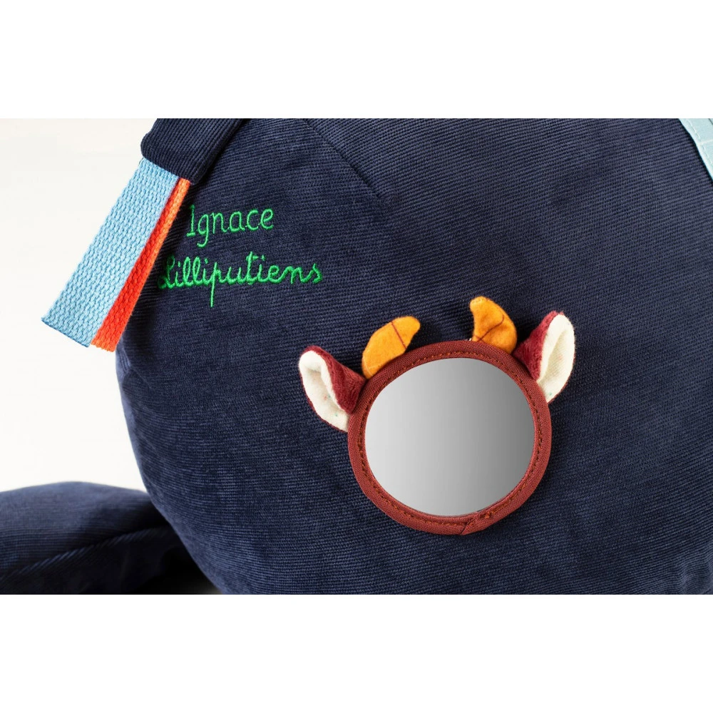 Il propose plusieurs activités sonores et sensorielles (différentes matières à toucher, une clochette, du papier qui croustille, un miroir…) et cache une grande poche secrète pour ranger le pyjama et le doudou de votre enfant.
