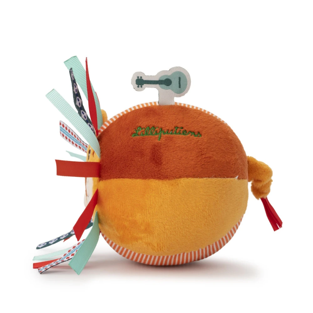 Balle en tissu tout doux Jack le lion avec un grelot, des tas de petits rubans et une étiquette avec une guitare à agripper.