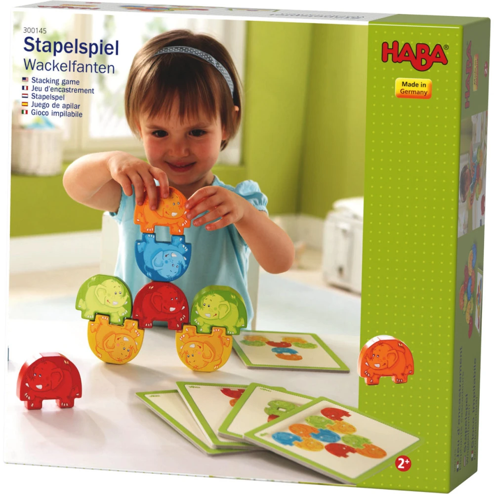 « Les éléphants cascadeurs » de Haba est un premier jeu d’encastrement et d’adresse pour les enfants dès 2 ans.