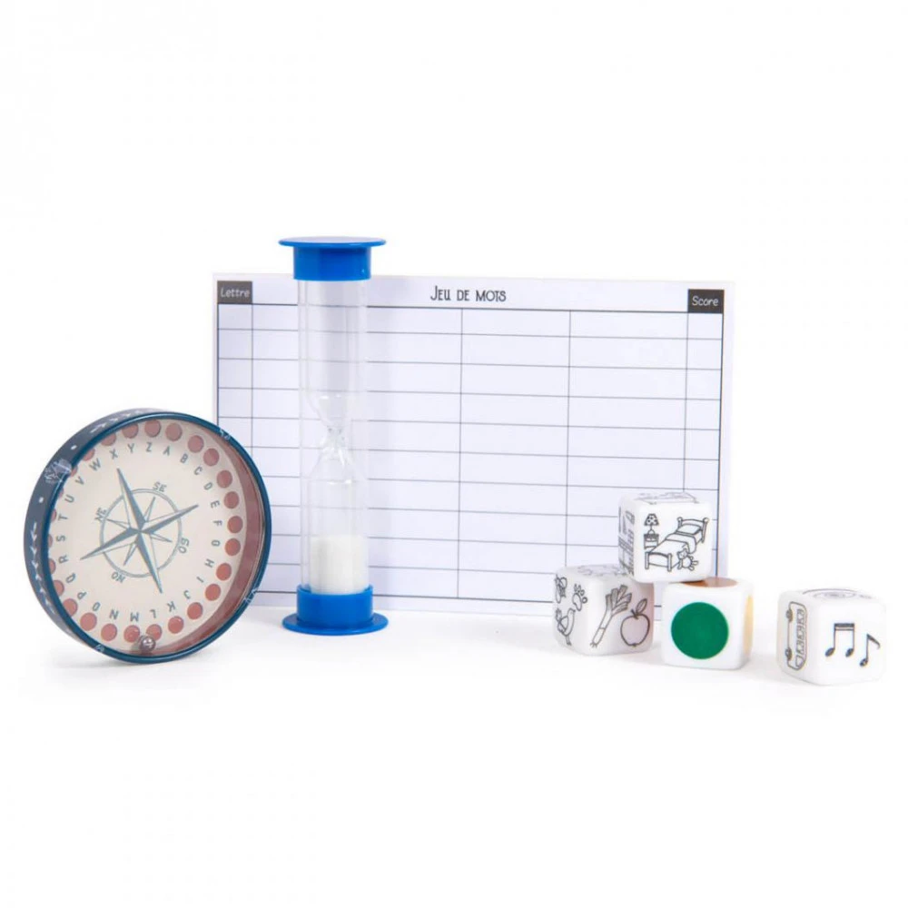Comprend 4 dès à thèmes, une boîte alphabet avec une petite bille, des carnets de notes et un sablier.