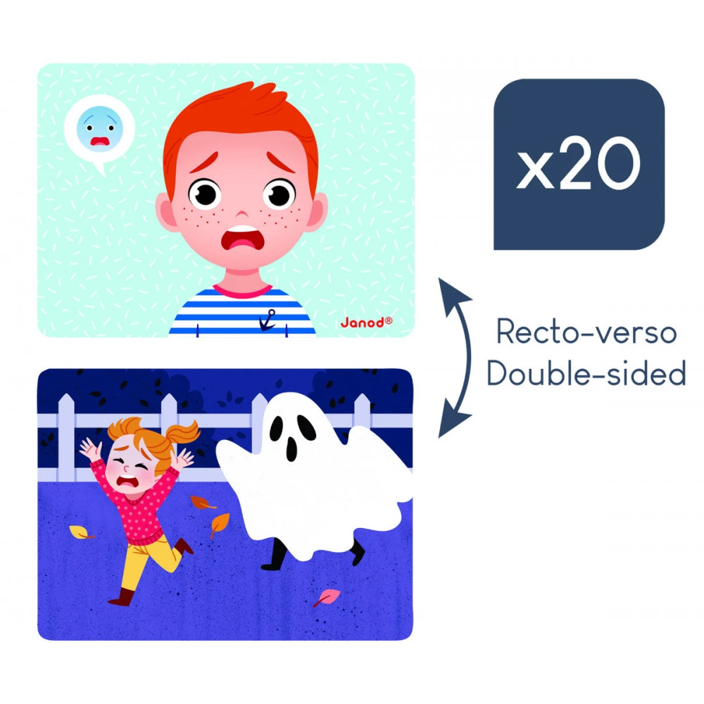 Ce jeu s’accompagne d’un guide des émotions rédigé par des psychomotriciens pour aider les parents à trouver les bons mots et les bonnes explications à donner aux enfants.