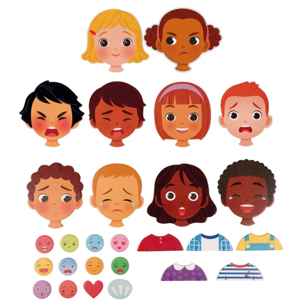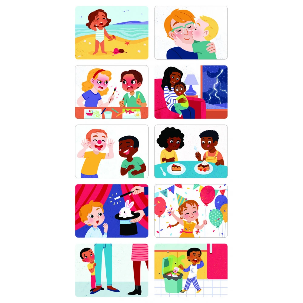 Découvrez avec votre enfant 10 émotions de la vie : la joie, la peur, la tristesse, la colère, la timidité, l’amour, le dégoût, le rire, la jalousie et la surprise.