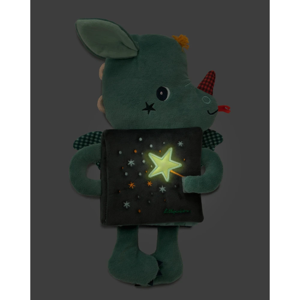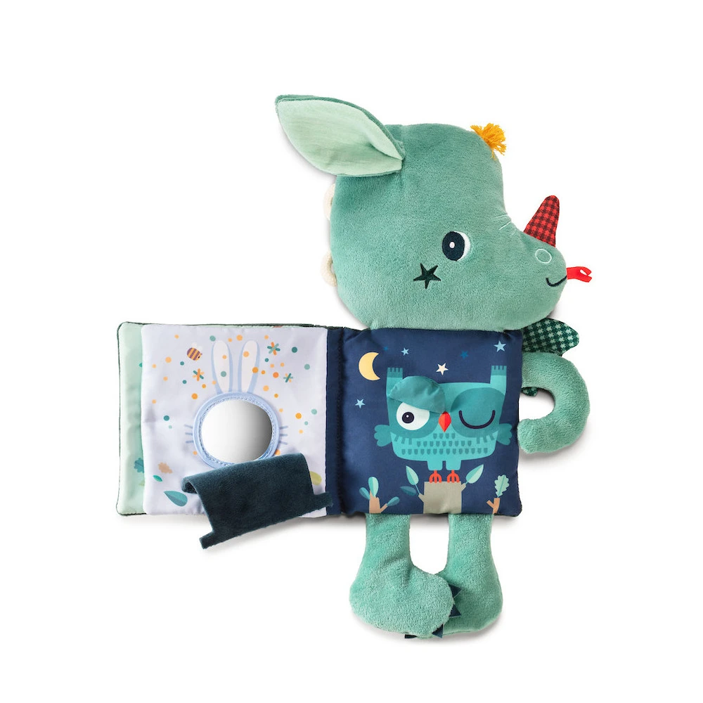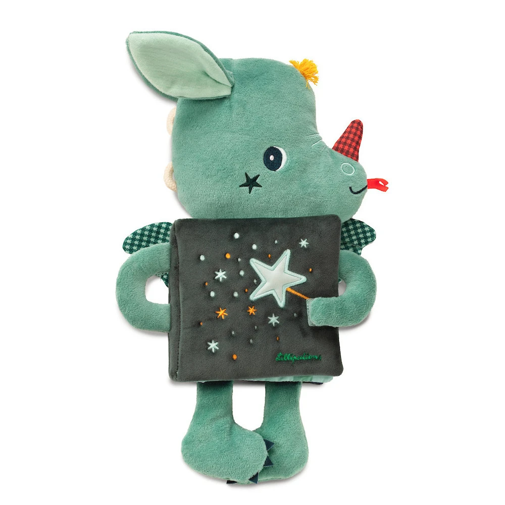 Le livre doudou Joe le dragon de Lilliputiens est une peluche toute douce accompagnée d’un livre avec un miroir, un petit hochet et des bruits de papier.
