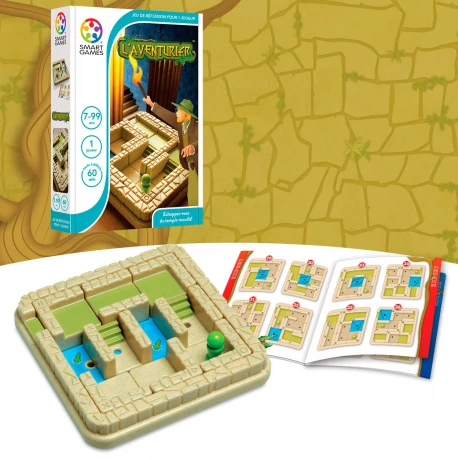 Comment jouer ? Placez les 8 pièces amovibles sur le plan de jeu tel qu’indiqué sur le défi choisi puis, faites coulisser les différentes pièces pour permettre à votre aventurier de se déplacer jusqu’à atteindre la seule sortie possible. Attention, votre aventurier n’est pas un surhomme : il ne sait ni traverser les murs, ni les escalader et encore moins nager parmi les crocodiles!!!