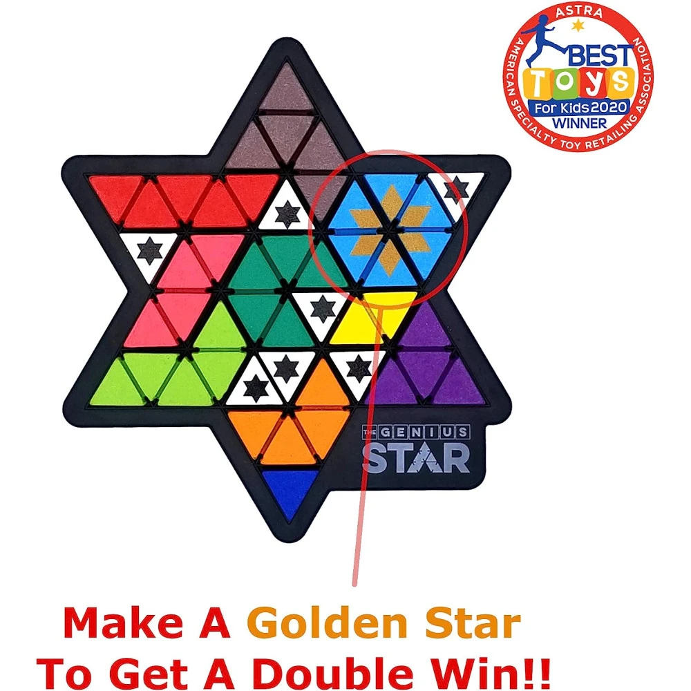 Seul ou l’un contre l’autre, relevez le défi de l’étoile de génie de Smartgames en complétant les 48 espaces triangulaires.