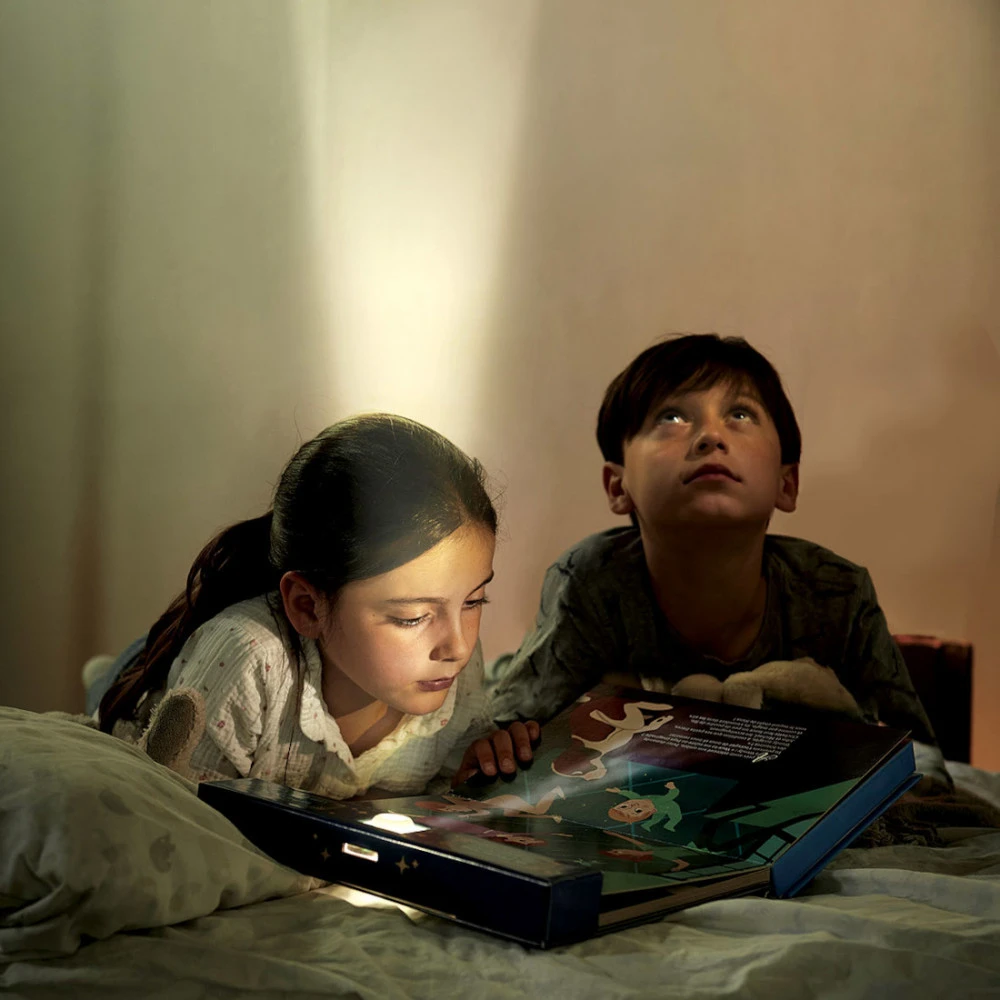 Livre à lire dans le noir grâce à la lampe qui éclaire les pages et au projecteur qui va reproduire 9 scènes de l’histoire sur le plafond.