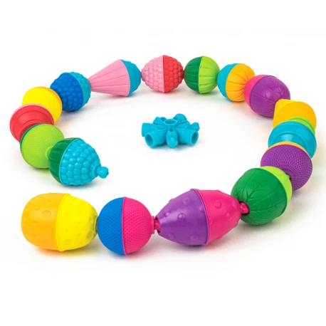 Dès 10 mois, l’enfant va manipuler, assembler les perles et découvrir les formes, les couleurs et les textures. A 15 mois il va ouvrir et fermer les perles en tournant. A 18 mois, il va les mélanger et les combiner à l’infini. A 24 mois, il va réaliser ses premières constructions et à 36 mois, il parviendra à les lacer.