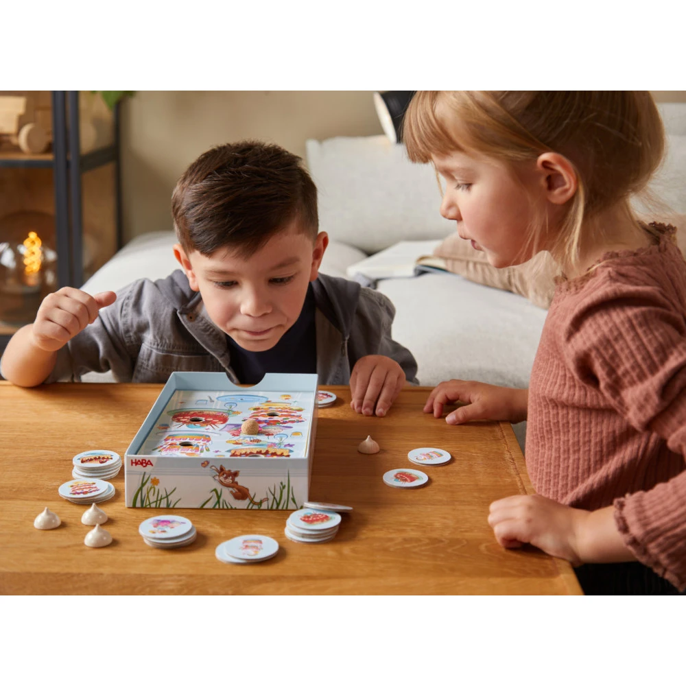 « Le gateau d’anniversaire » de HaBa est un excellent jeu de souffle où l’enfant va devoir souffler sur une bille pour atteindre les bons gateaux et remporter des pots de crème chantilly.