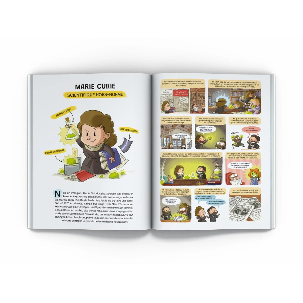 Cette bande dessinée de 52 pages présente l’histoire de 10 femmes qui ont marqué l’histoire comme la physicienne Marie Curie, la militante Rosa Parks ou encore la cosmonaute Valentina Terechkova