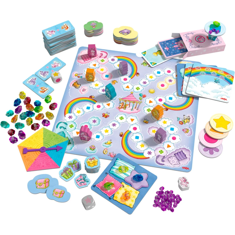 Une belle grande boîte avec une collection de 9 jeux : des jeux de plateaux, de mémoire, de dominos, de cartes et d’adresse et 78 cristaux multicolores.