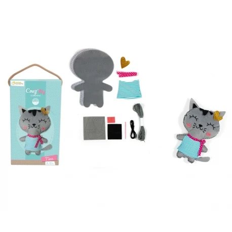 Le Little Couz’in contient des pièces de feutrine pré-troués et/ou adhésives, du rembourrage, une aiguille en plastique, 4 bobines de fils, du ruban et une notice explicative.