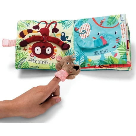 Livre en tissu tout doux et plein de découvertes où bébé César embrasse tous ses amis avant d’aller au lit.