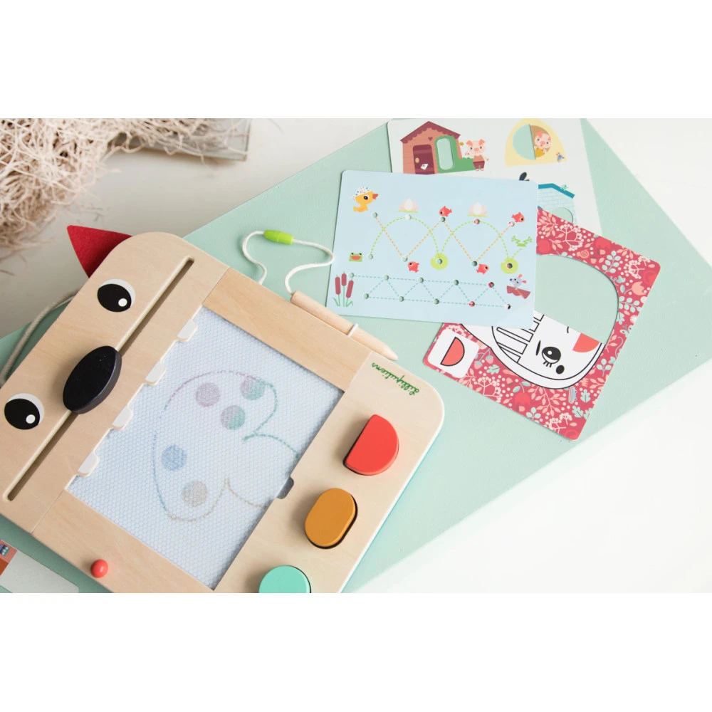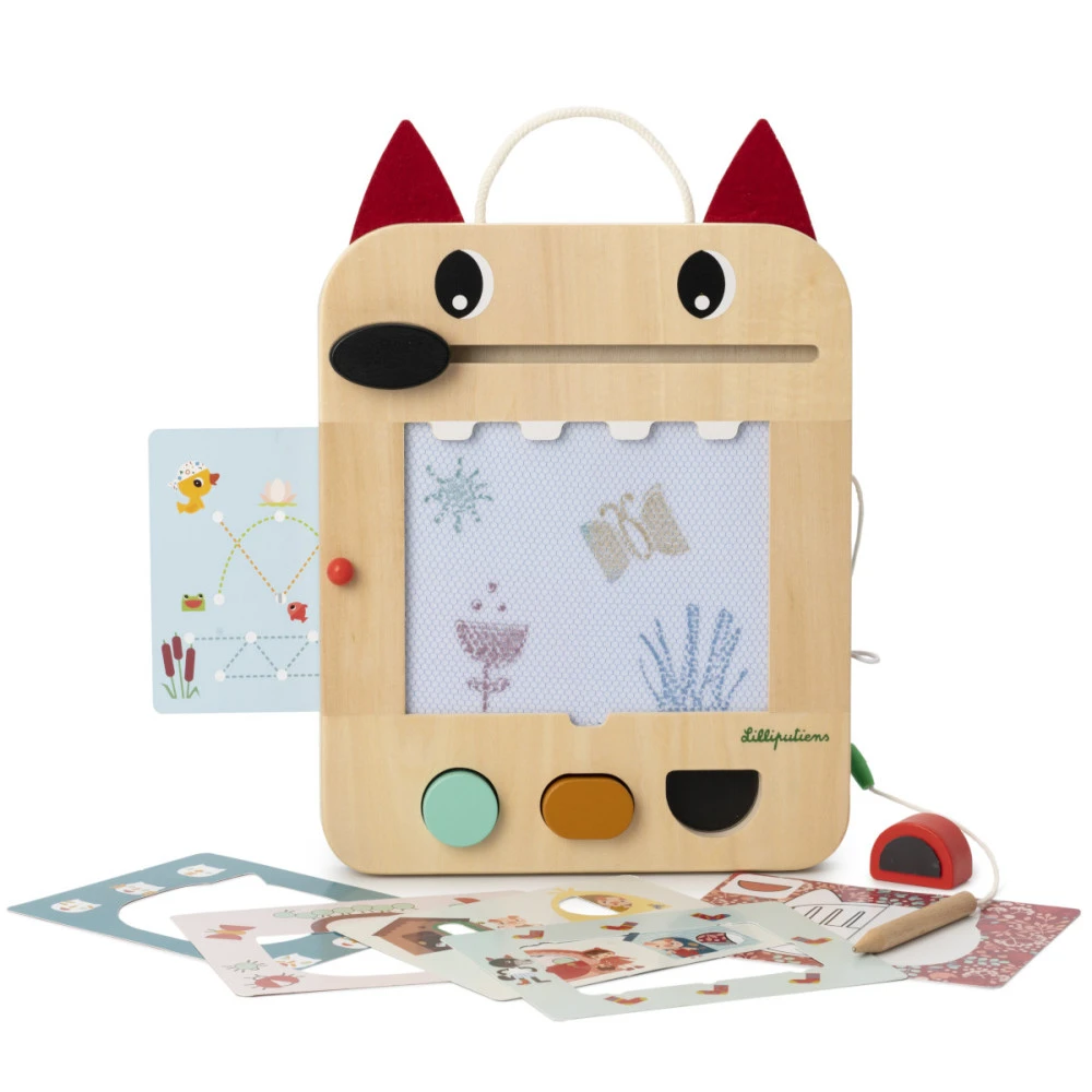 Ardoise en bois (oreilles du loup en feutrine) avec 3 formes géométriques, 1 crayon attaché à une corde pour ne pas le perdre et 6 cartes recto-verso avec des jeux qui se rangent dans la fente prévue à l’arrière de la tablette.