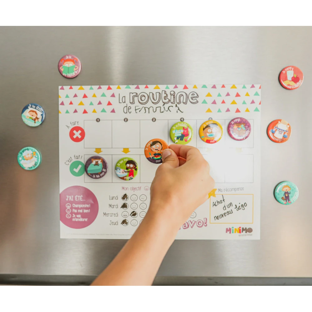Place 6 aimants (ou plus) sur la première ligne du tableau « Ma routine quotidienne ». Dès que l’enfant a fini une tâche, il descend l’imant correspondant sur la ligne du bas. Fin de journée, tous les aimants sont sur la deuxième ligne ? Objectif atteint ! Bravo à l’enfant.