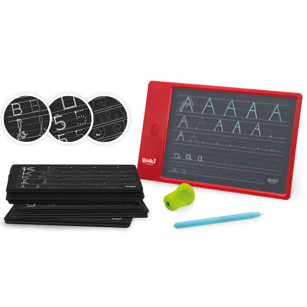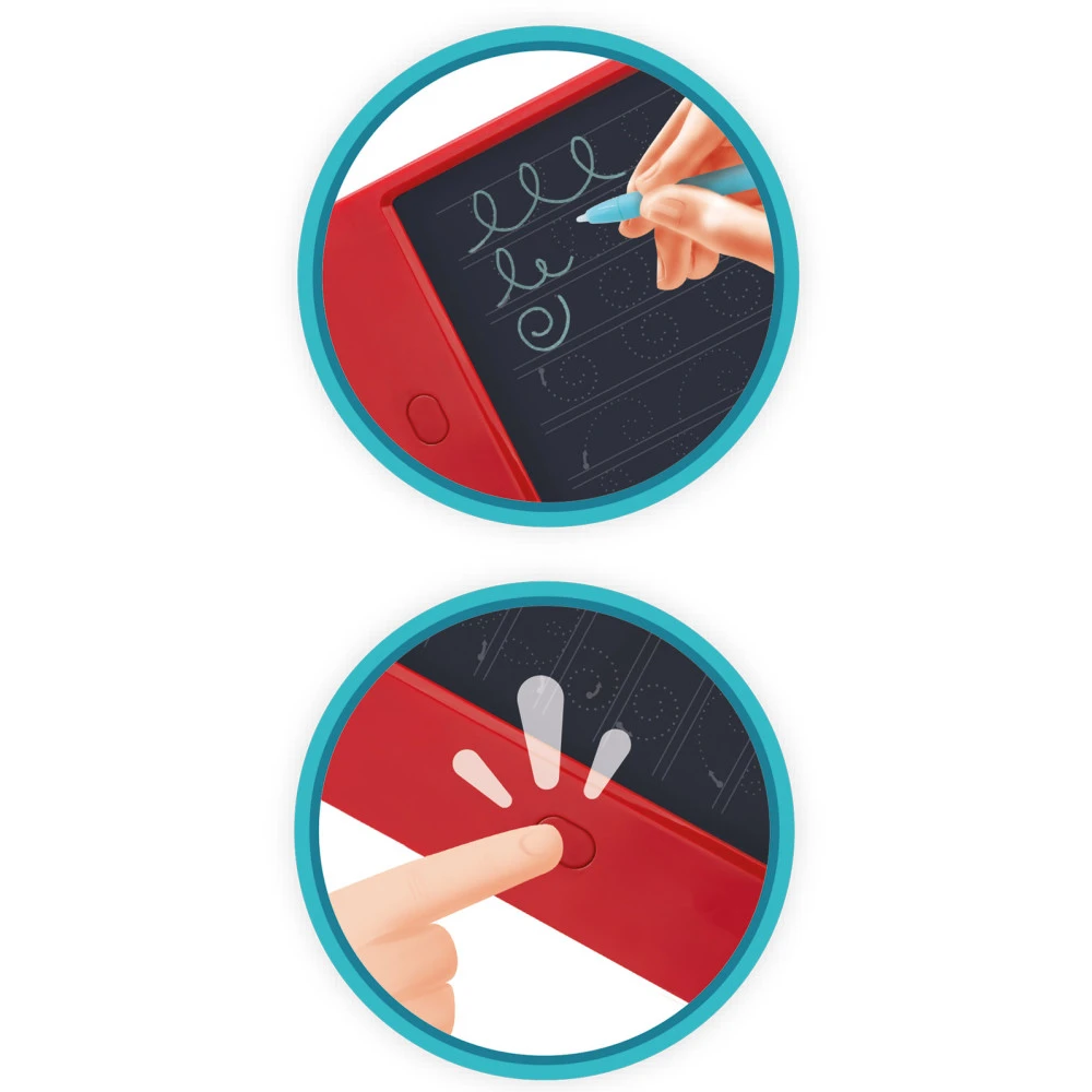 L’enfant va placer une fiche sous la tablette et s’amuser à suivre le tracé grâce au stylet et ainsi, petit à petit, écrire ses premières lettres.