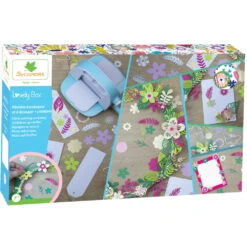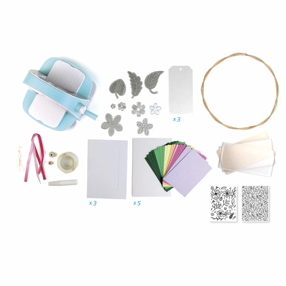 Contient 1 machine à embosser et découper pour papier de format A6, 4 formes de découpe, 1 plaque de forme à embosser et 2 plaques pour découper, 1 couronne, 2 marque-pages, 1 carte, 1 cadre photo et différents papiers.