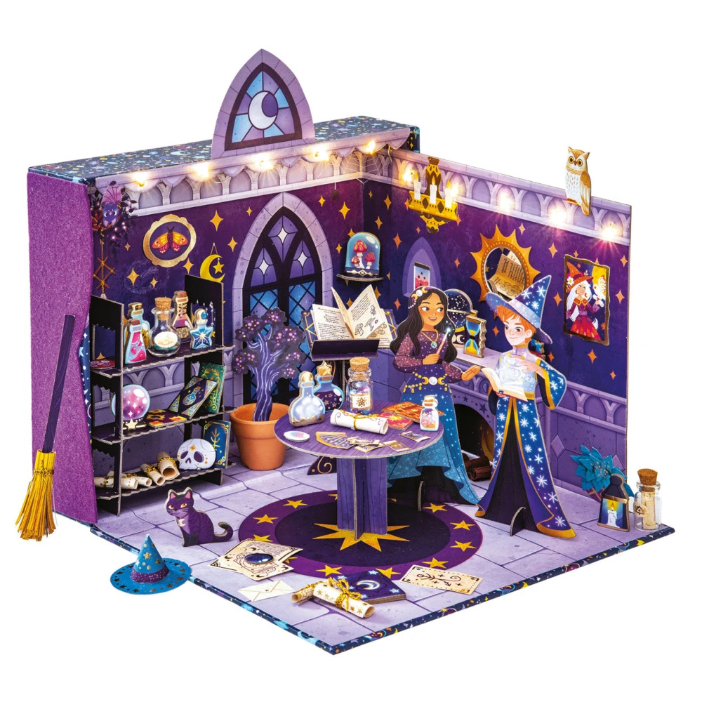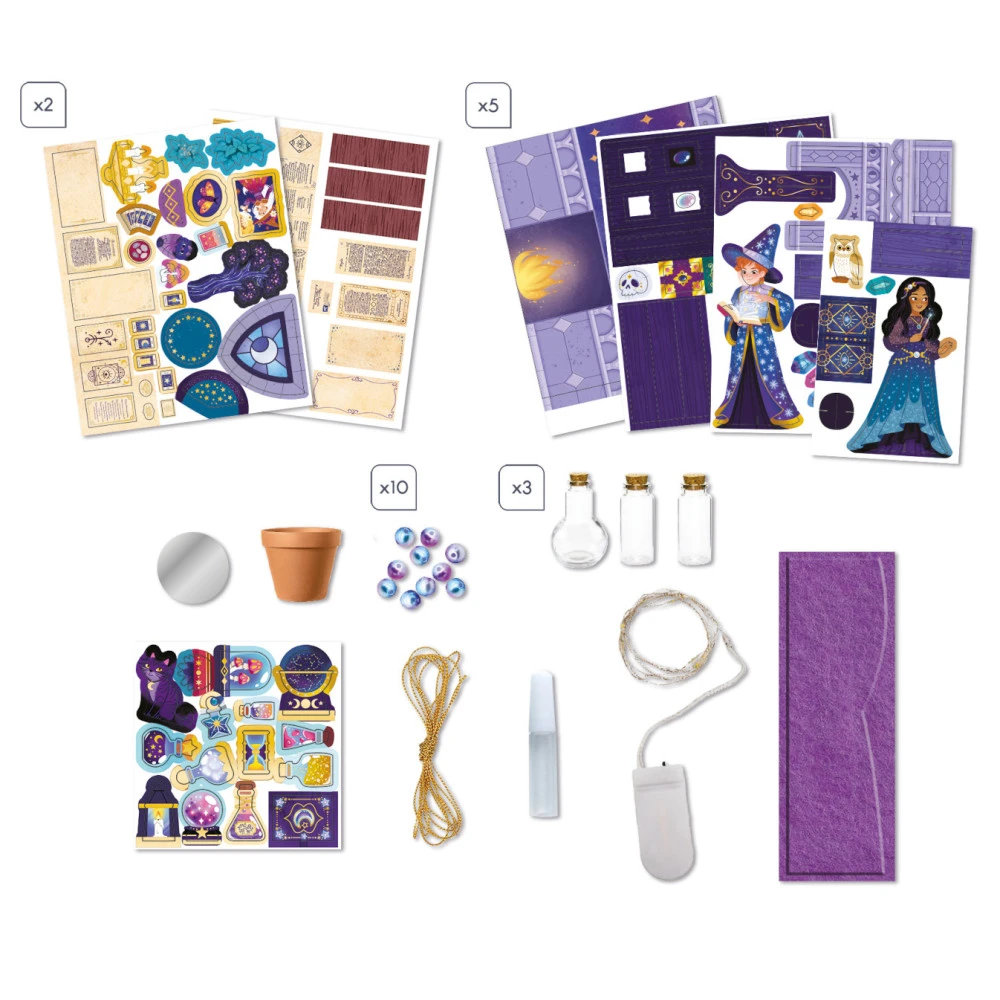 Contenu de la boîte rigide (qui sert de support pour la réalisation) : 7 planches de carton et papier prédécoupés, 1 planche de feutrine prédécoupée,1 tube de colle, 1 guirlande lumineuse (piles incluses), 3 fioles en verre, 1 miroir autocollant, des perles nacrées, de la ficelle dorée, 1 pot en terre cuite et 1 livret explicatif