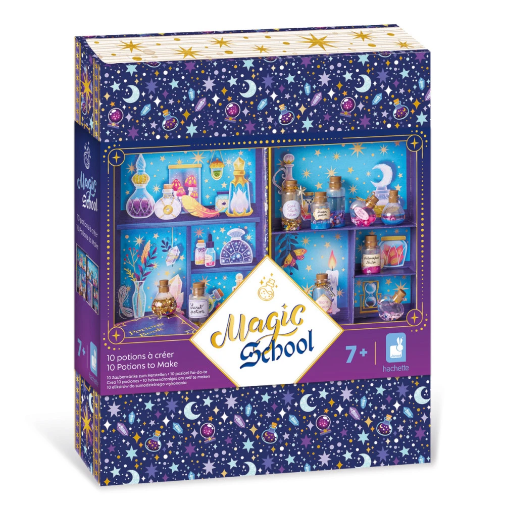 Contenu : 10 fioles en plastique avec bouchon, 2 tubes de sable, 20 perles acrylique, 1 breloque baguette magique, 1 baguette clé, du fil doré, 1 entonnoir, 2 sachets de mini-strass, 1 sachet de mini canes (3 modèles), 1 sachet d’étoiles, 1 sachet de confettis métalliques, 1 planche de stickers et 1 grimoire avec les recettes.