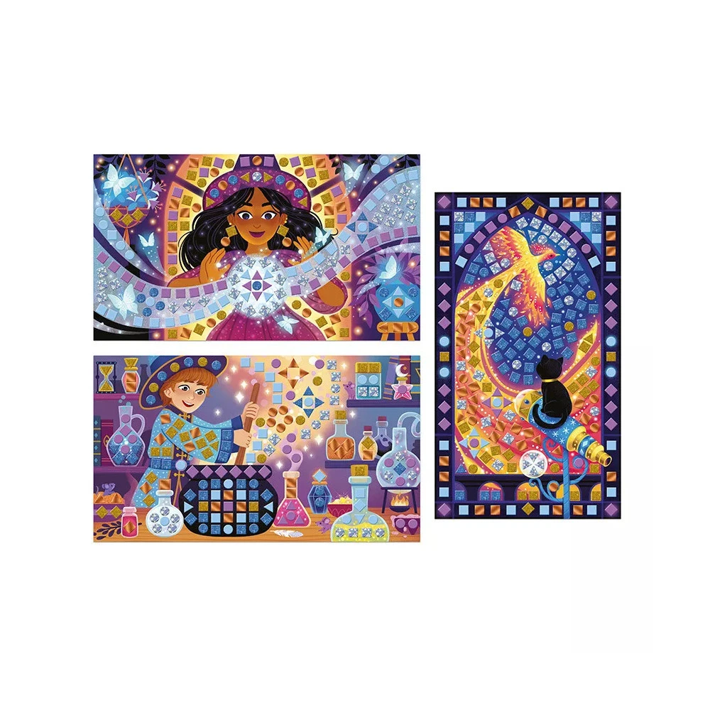 Dans la collection des apprentis magiciens Magic School, un coffret créatif pour réaliser, à l’aide de mosaïques en mousse autocollantes, 3 tableaux : l’envol du phoenix, la magie d’une boule de cristal et l’ébullition d’un mystérieux chaudron.