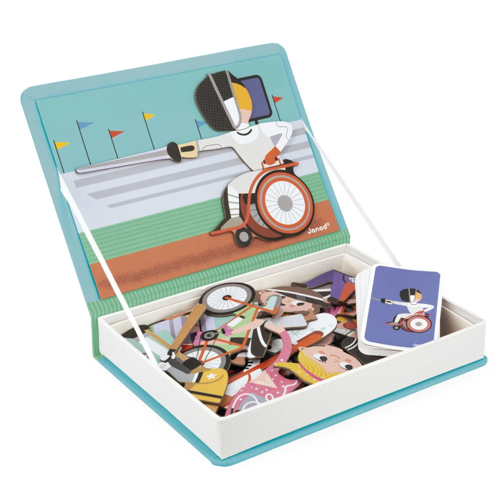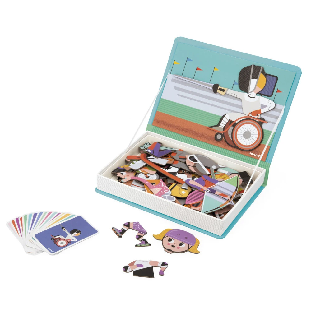 Les Magneti’book de Janod sont des jeux éducatifs malins qui s’ouvrent comme un livre. Une fois le livre ouvert, le but du jeu est de recomposer le modèle de la carte à l’aide des magnets ou de laisser libre cours à son imagination et d’inventer de nouvelles scènes ou personnages. Magnétique, il est parfait pour jouer en voiture.