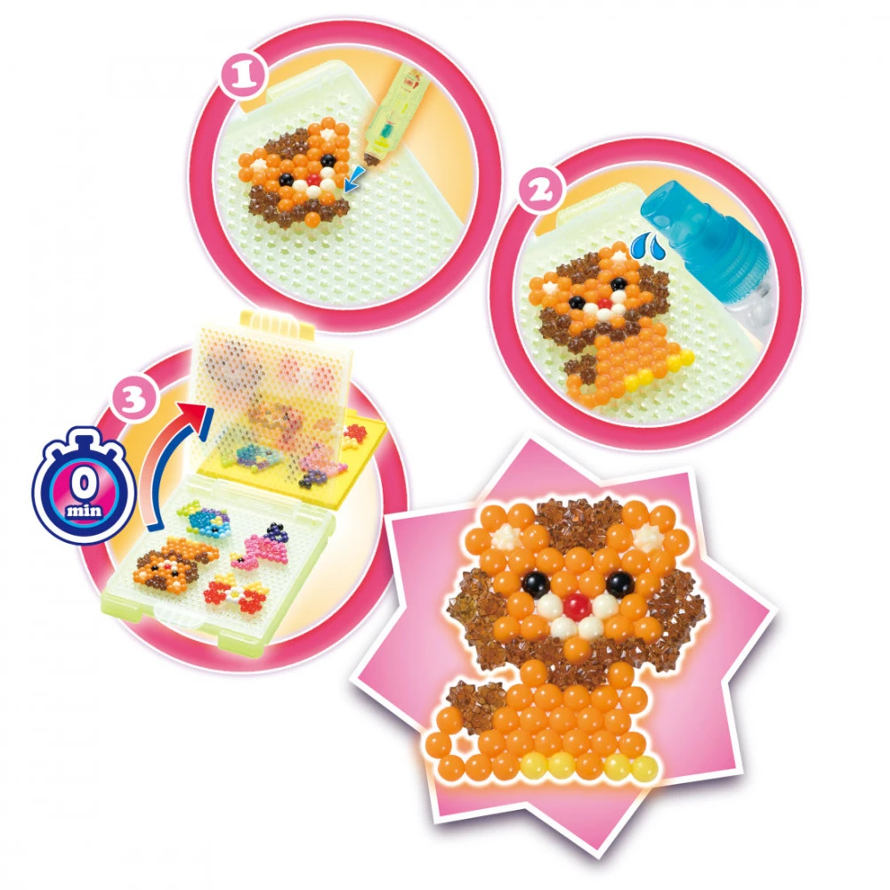 Comment faire des créations avec Aquabeads ? A l’aide du stylo, place les perles sur le support. Vaporise ensuite un peu d’eau pour que les perles collent ensemble. Laisse sécher et c’est réussi.