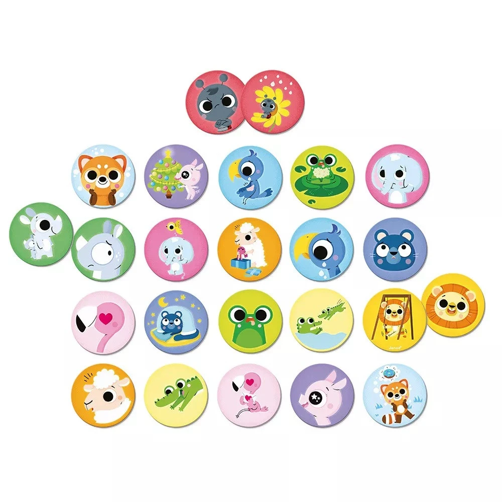 Avec ce jeu de mémo sur les émotions, l’enfant va découvrir et jouer avec les émotions des animaux rigolos et stimuler son sens de l’observation et sa mémoire.