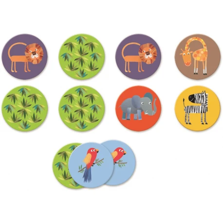 Contient 30 pièces rondes et illustrées en carton (7,8 x 7,8 cm) représentant différents animaux de la jungle.